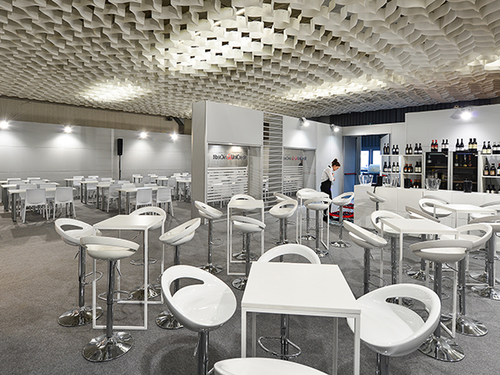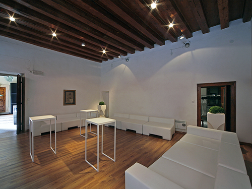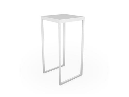 Tavolino alto con ripiano in nobilitato e gambe verniciate in metallo a sezione rettangolare.